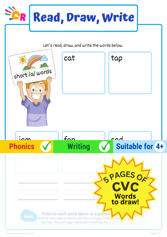 Read, Write, and Draw is a five-page phonics activity that helps children build confidence in CVC words while sparking creativity and faith.