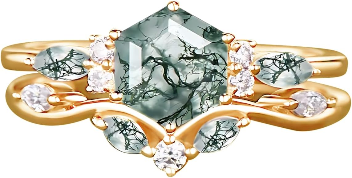 【About Rikelus Jewelry Brand】 Rikelus jewelry brand aims to "light up every moment, shine every story", and is committed to making every piece of jewelry a witness of time and a transmitter of emotion with unique design and exquisite craftsmanship. Everyone's story is unique, so we provide personalized customization services and design exclusive jewelry works according to customer needs and stories. 【Product Features】 This natural moss agate bridal bands sets available with different carat gemstones and metals of your liking. The green minerals contained in the moss agate form different patterns, further enhancing the artistic charm of the ring. Moss agate contains the green mineral, which was believed to have healing properties in early times. It symbolizes longevity, health, prosperity, and success. It is often seen as a talisman that brings wealth and wards off evil and negative energy. Personalized jewelry choose from a variety of metals, gemstones and designs. Our jewelry absolutely are the excellent gift you choose to commemorate the occasion reflecting the beauty of the moment. 【Product Specification】 Material: 10K/14K/18K solid gold/S925 sterling silver with 1-3 carat natural moss agate Color: White Gold/Yellow Gold/Rose Gold/Black Gold Size: 4-12 PACKAGE: Jewelry*1 ; Wipe Clothing*1; Gift Box*1 【Customized Steps】 First step: click the yellow button “Customize Now” Second step: choose the ring material, color, stone carat, size and engraved text Third step: click the button “Add to Cart” Fourth step: check information and submit orders