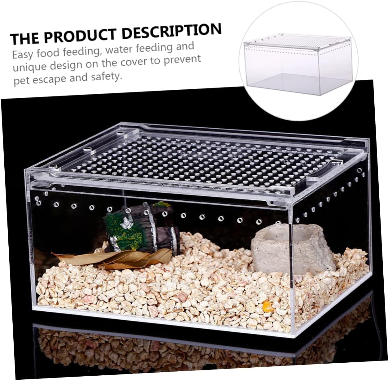 Package List 1 x Reptile Feeding Box Characteristics - Color: Transparent reptile storage nest. - Material: Acrylic case for reptile. - With large and comfortable space for them to play or have a rest in the tank Acrylic Breeding Tank. - The transparent breeding box is very easy to take care of. and climbing pet feeding container. - Suitable for turtle, spiders, snakes, , hermit crabs, etc transparent case for reptile. - The reptile feeding box is the and comfortable living nest for reptile Reptile Terrarium Habitat. - feeding, water feeding and unique design on the cover to pet escape and safety.Goods DescriptionReptile Terrarium Habitat Made of acrylic material, and .reptile storage nest It's and for crab, , small turtles and other small crawler animals.transparent case for reptile The breeding tank allows for the easy without harming small pets.case for reptile The transparent case is sanitary and animals friendly and can be re-used
