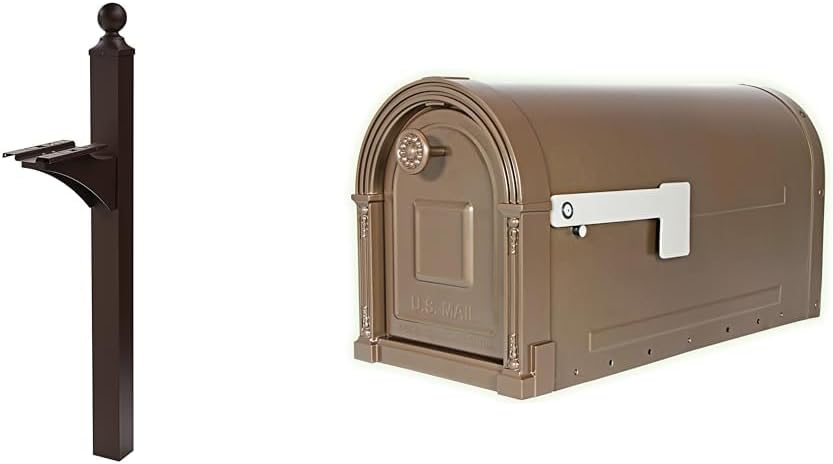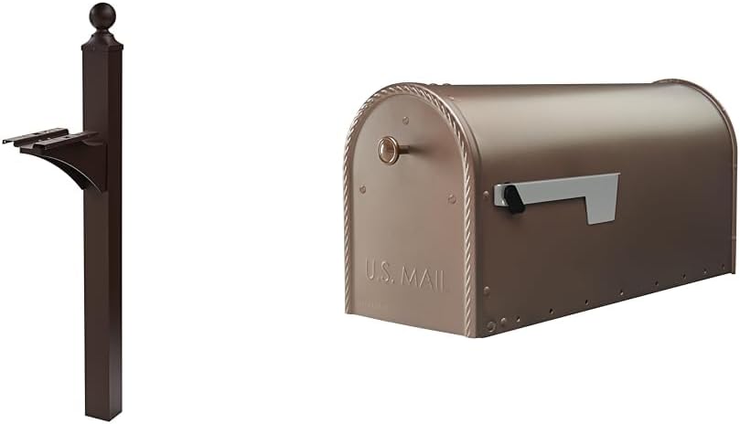The Architectural Mailboxes bundle combines a durable Landover aluminum mailbox post with a large capacity Edwards galvanized steel mailbox to provide a complete mail storage solution. The Landover post is designed from rust-resistant extruded aluminum with a steel cross arm to resist weathering. It conveniently installs over a 4x4 wooden post (sold separately) and supports up to 60 lbs distributed weight capacity. The included mounting bracket and hardware ensure quick setup. Paired with the post is the Edwards mailbox, featuring a glossy black powder-coated finish made of rust-resistant galvanized steel. Its oversized interior easily accommodates high volume mail. The magnetic door latch, decorative pull knob, and satin nickel outgoing mail flag add visual appeal. Pre-drilled mounting holes allow swift installation. With corrosion-resistant constructions, these complementary mail storage components are built to last. The Landover's hollow post design matches the Edwards' B compatibility for unified mounting. Together they provide an attractive, high capacity mail storage solution with quick installation.