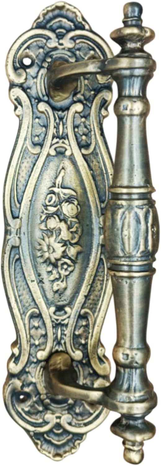 Bring timeless European elegance to your door with this ornate solid brass cranked pull handle, inspired by 19th century French Rococo and Baroque Revival design. The decorative backplate features intricate scrollwork framing a central floral cartouche motif, creating a refined architectural statement. The offset cranked handle provides both ergonomic comfort and visual depth, while the contrasting antiqued detailing enhances the craftsmanship and highlights the engraved patterns. Manufactured from solid brass, this handle offers durability, weight, and long-lasting performance suitable for both interior and exterior wooden or composite doors. The traditional casting and finishing process gives each piece subtle variations that enhance its authentic character. An ideal choice for period homes, restoration projects, classic interiors, or anyone seeking distinctive decorative hardware.Design Type: Cranked Backplate Pull Handle Style Influence: French Rococo / Baroque Revival Era Inspiration: Late 19th Century (Belle Époque / Victorian Continental) Motif Details: Elaborate floral and scroll engraving Oval cartouche centerpiece with botanical motif Decorative curved (cranked) handle for ergonomic grip Contrasting antiqued blackened recess detailing Ornate symmetrical backplate silhouette Traditional cast brass craftsmanship Specifications:Patina: Antique, Unlacquered Living Finish Material: Solid Brass Full-length: 9.4 in (24 cm) Grip Length: 8.1 in (20.5 cm) Grip Width/Diameter : 1 in (2.5 cm) Projection : 2 in (5 cm) Pull Handle Rosettes/Backplate Length: 9.4 in (24 cm) Pull Handle Rosettes/Backplate Width : 2.4 in (6 cm) Center-to-Center (Between Screw Holes) : 6.9 in (17.5 cm) Weight: 1.7 lb (790 gr)* Sold individually (1 pull handle). * Suitable for internal and external wooden or composite doors. * Surface mount fixing: The handle is secured from the front of the door using screws. Fixings are installed from the exterior face only, with no visible fixings on the reverse side. * Fixings included: Supplied with mounting screws. We recommend confirming suitability with your door manufacturer to ensure compatibility with your specific door type. * Handcrafted product: Due to the handmade nature of this item, all dimensions are approximate and provided as a guide only. * Finish variation: Slight variations in finish, tone, and appearance may occur due to lighting during photography and the handcrafted finishing process. * Natural characteristics: While every item undergoes strict quality control, minor surface marks or small imperfections may be present as a result of the traditional sand casting and finishing process. These are not defects but part of the product’s character.