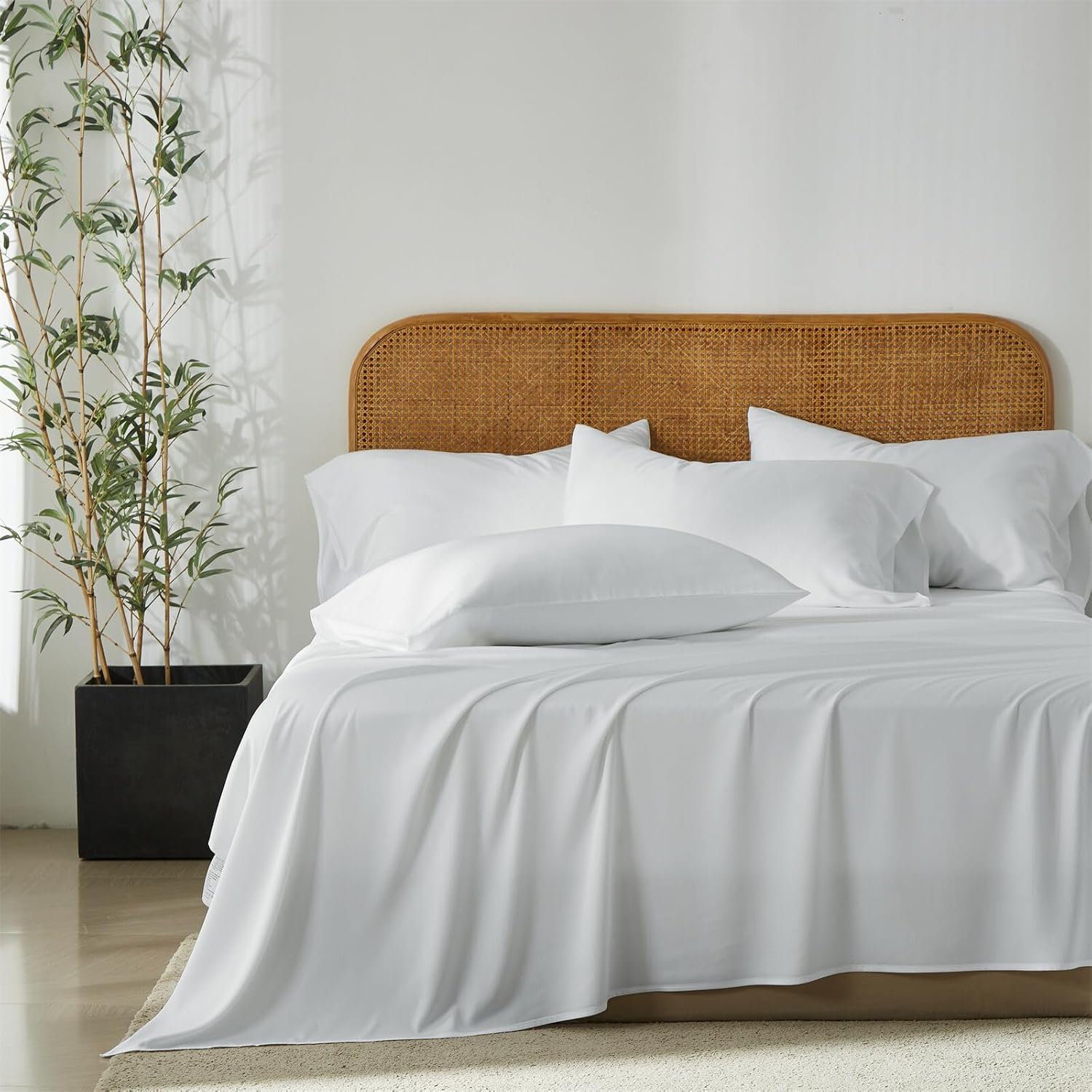 Indulge in the Ultimate Sleep Experience with YASMENG 100% viscose Derived Bamboo Sheets Experience the revolutionary comfort of 100% viscose derived from Bamboo. Our 4-piece bed sheet set is meticulously crafted to provide a silky soft, incredibly smooth, and luxuriously cool feel against your skin. The natural breathable and quick-drying properties keep you dry and comfortable all night long Unmatched Comfort & Quality: Woven from premium viscose made from sustainable bamboo, these sheets are not just soft; they are a new standard in bedding. The fabric is lightweight, breathable, and perfect for all seasons, offering a cooling sensation in summer and cozy warmth in winter. Say goodbye to night sweats and hello to uninterrupted sleep. Perfect Fit Guaranteed: The fitted sheet features a full 18-inch deep pocket with a secure elastic all around, designed to stay firmly in place even on extra-deep mattresses. No more struggling with loose corners or sheets that pop off in the middle of the night. What's Included in Your Set: Your complete 4-piece set includes one flat sheet, one fitted sheet (with 18" deep pocket and 360 elastic round), and 1 or 2 pillowcases – everything you need to transform your bed into a sanctuary of comfort.