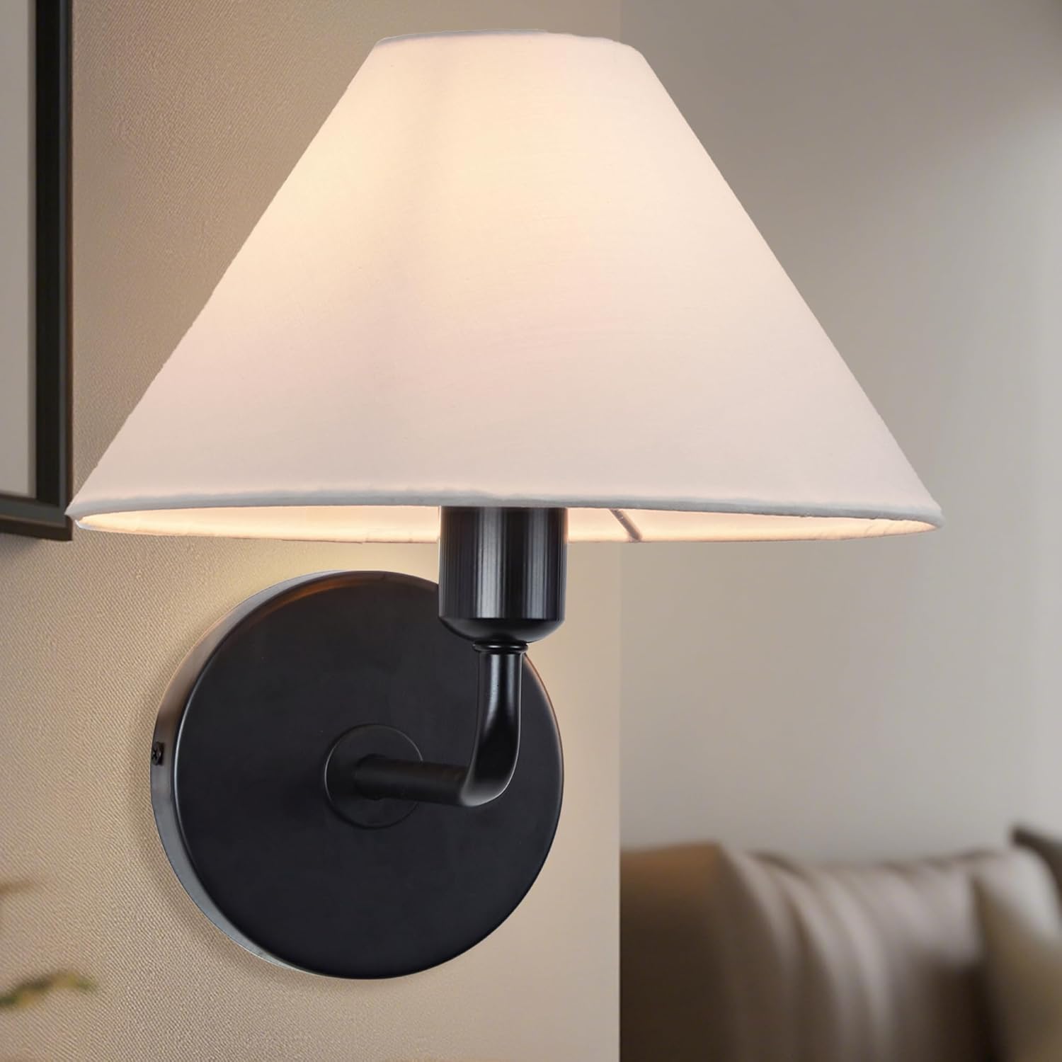 ♥WHY YOU WILL LOVE IT?A fresh take on a traditional architectural design.Tapered linen shade for modern proportions.Makes a statement in a living room or hallway.Contract Grade, so you know it's built to last.Linear look. A simple metal silhouette with sleek lines gives this sconce a soft elegance.Sophisticated shade. The tapered shade adds a contemporary complement to this piece.♥DETAILSSteel frame.Linen shade in White.Hardwired.This light fixture requires one E12 Socket.Compatible with dimmer switches (sold separately).This contract-grade item is manufactured to meet the demands of commercial use in addition to residential. Made in China.♥DIMENSIONS:Overall: 9.4"w x 10.3"d x 10.25"h.Wall plate: 5"diam.Shade: 9.4"diam. x 4.9"h.Product weight: 5.5 lbs.♥Service:Our lighting fixtures contain delicate and fragile components, such as glass globes, glass panels, crystal, alabaster, shell, and ceramic. If any parts are damaged during shipping, please contact us through Amazon's message, and we will be dedicated to providing you with the best service within 24 hours.