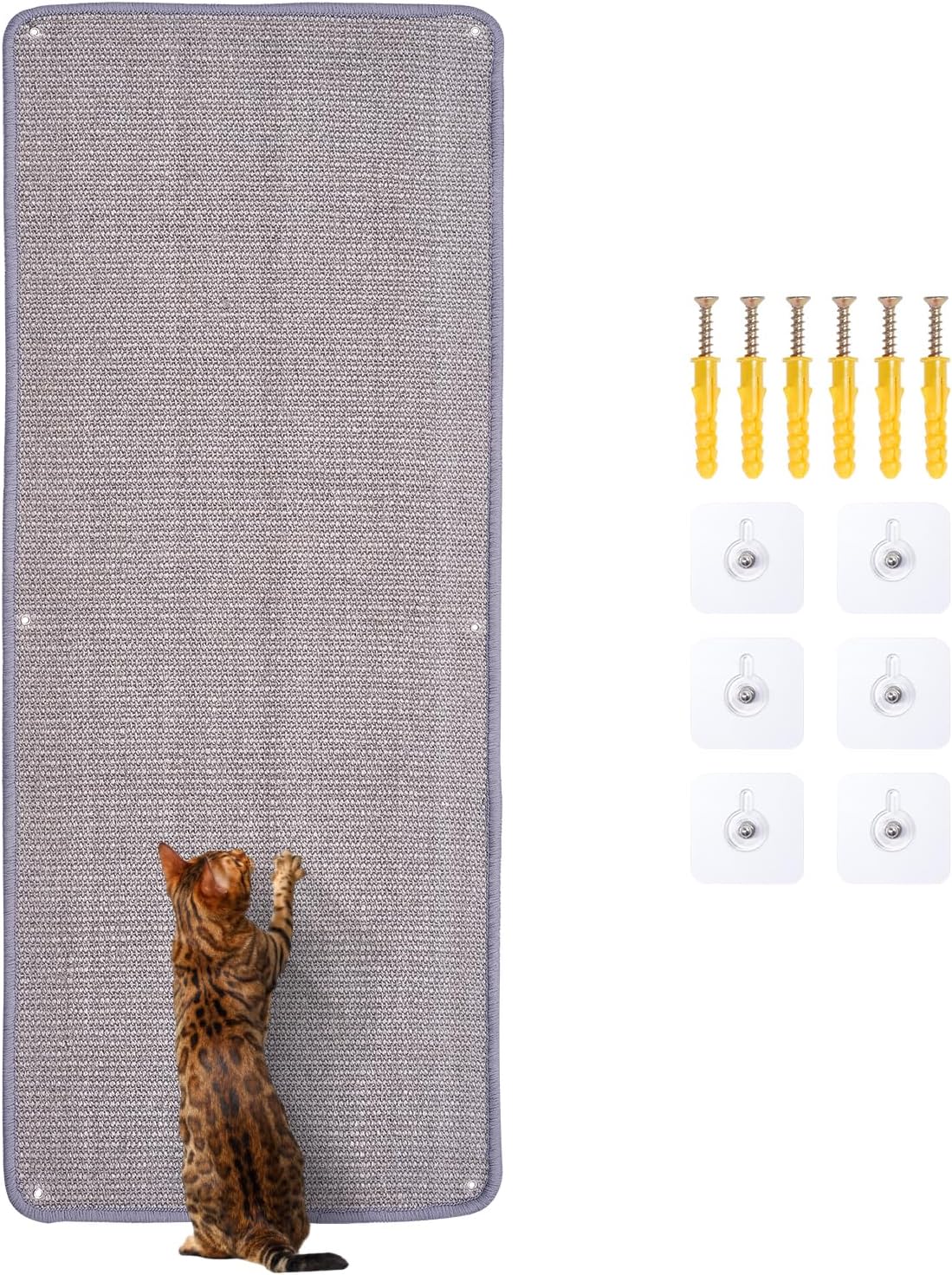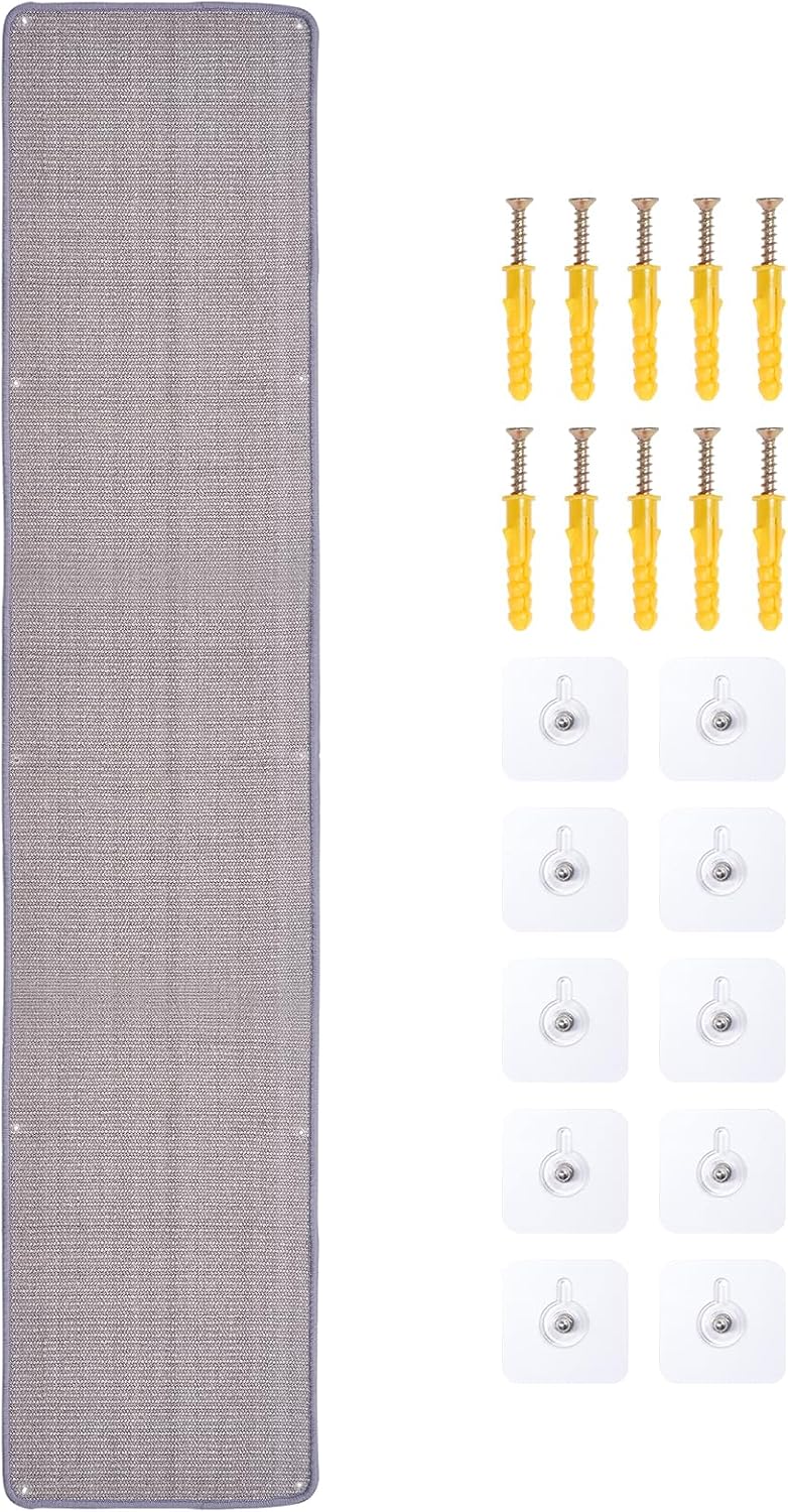 Uranshin 39.3x15.7in Thickened Cat Wall Climbing Carpet, Tall Cat Scratching Pad for Wall, Wall Mounted Climbing Carpet, Cat Scratcher for Wall Floor Couch Sofa Protector(2PCS) Size:15.7*39.3in (40*100cm) Weight: 4.4LB (2KG) Color: The natural color of sisal Material: 100% natural sisal material What you will receive: 1 piece of sisal cat scratch pad with anti slip bottom, 6 non perforated wall stickers, 6 sets of self tapping nails. PS:We will provide 2 extra nail and 2 wall sticker as backup, and you will actually receive 14 self tapping nails and 14 wall stickers.