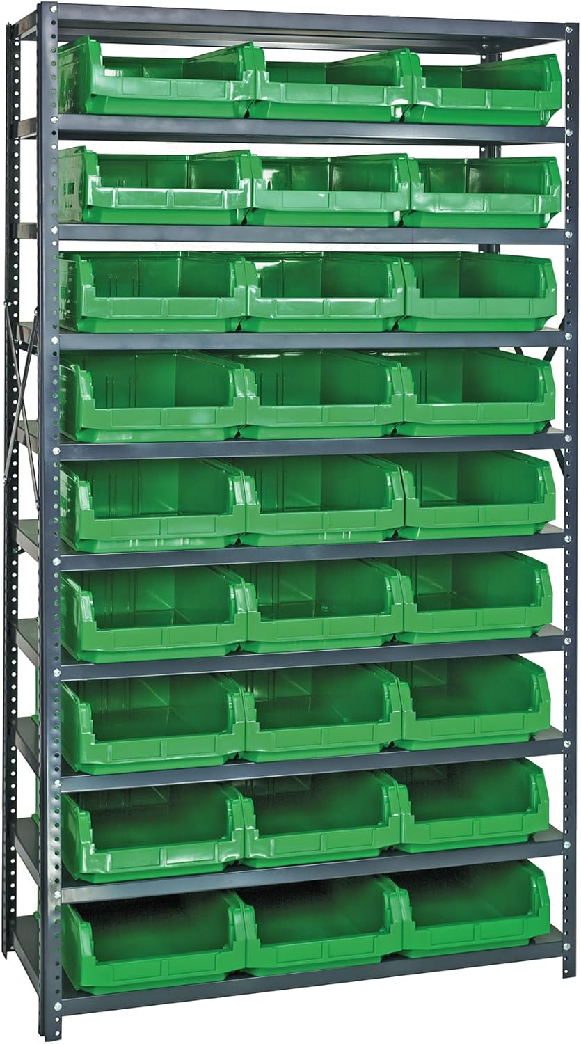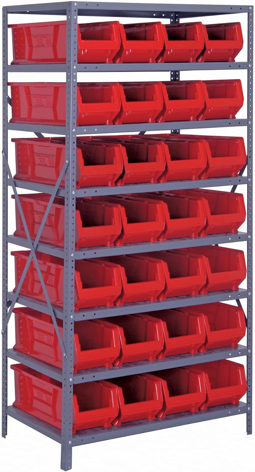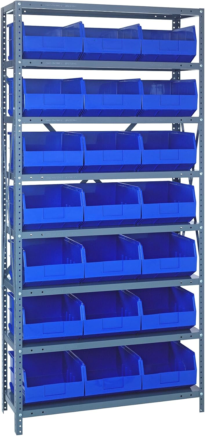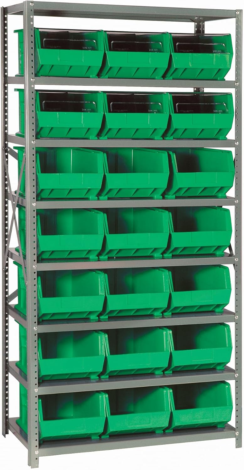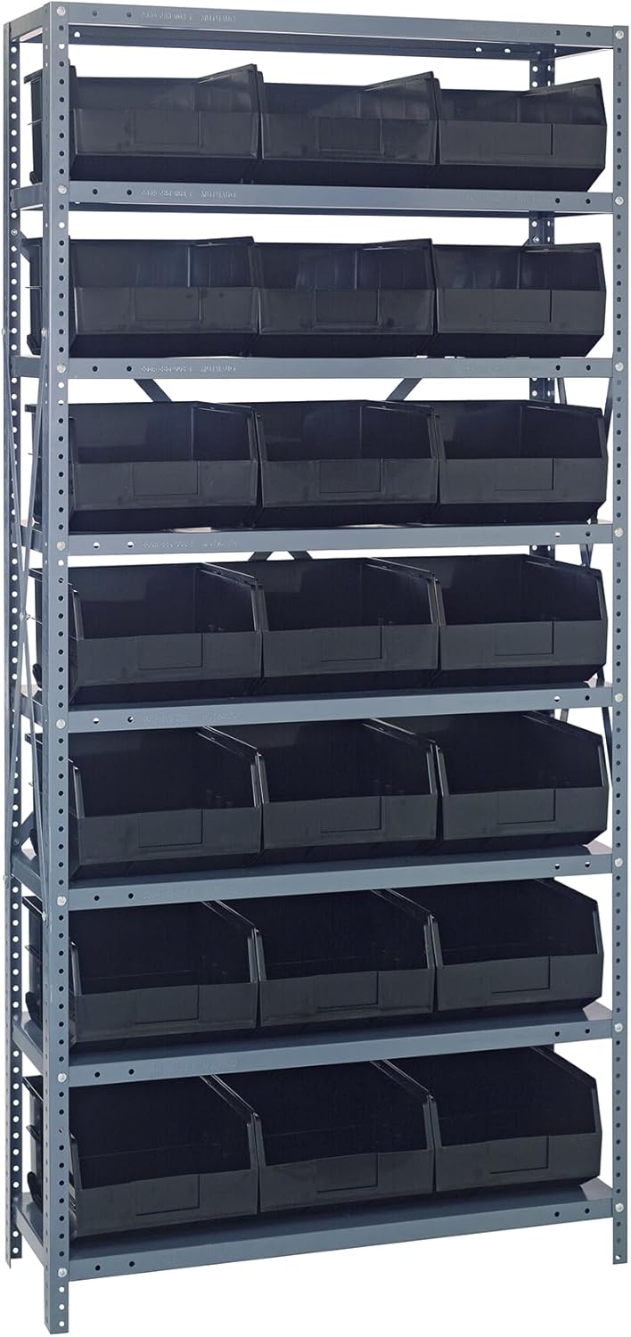 Shelving Unit, 24"D x 36"L x 75"H, heavy duty, 400 lb. load capacity per shelf, includes: (8) shelves, (12) 23-7/8"L x 8-1/4"W x 7"H (QUS950) and (12) 23-7/8"L x 11"W x 7"H (QUS952) bins available in multiple colors, uprights and cross bars, galvanized steel finish