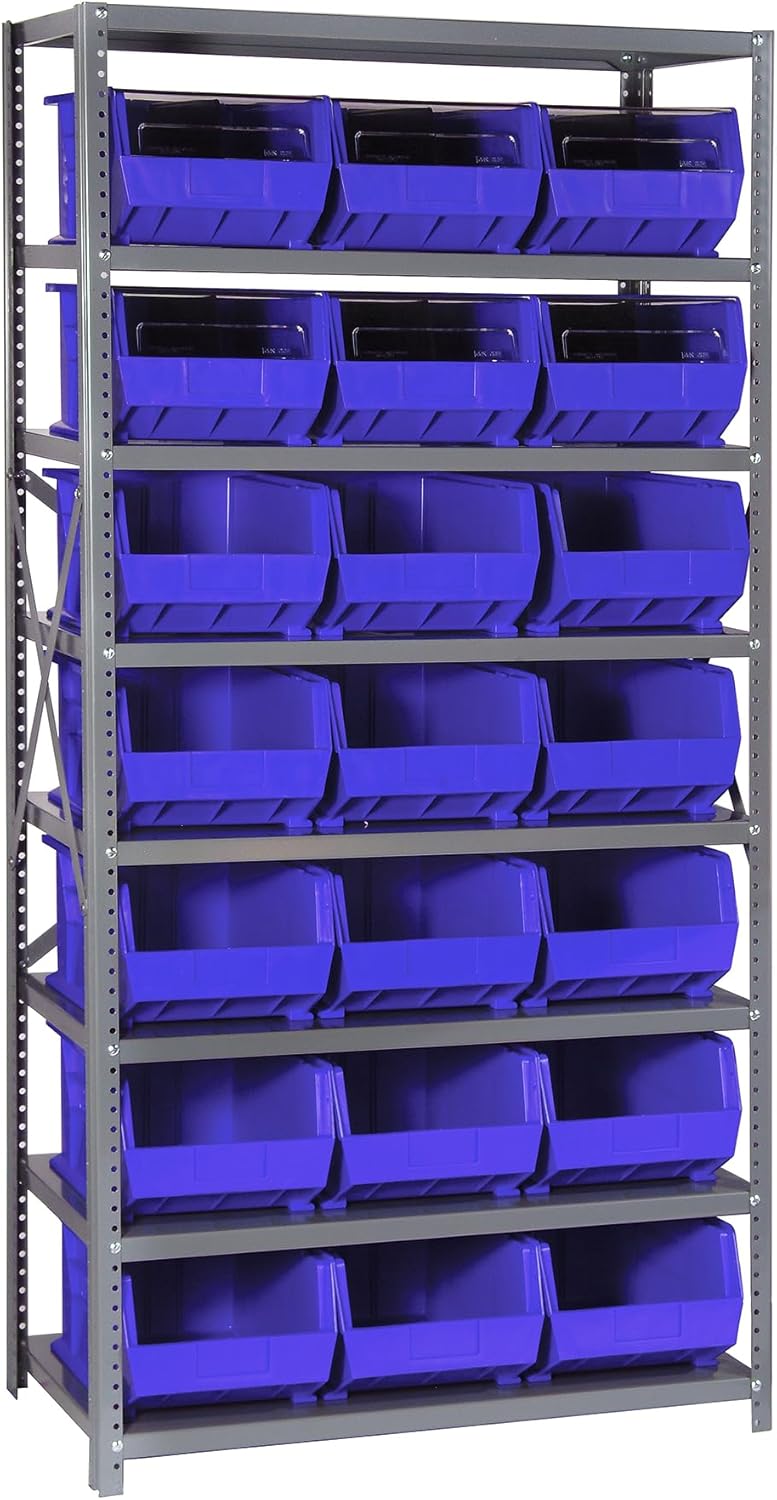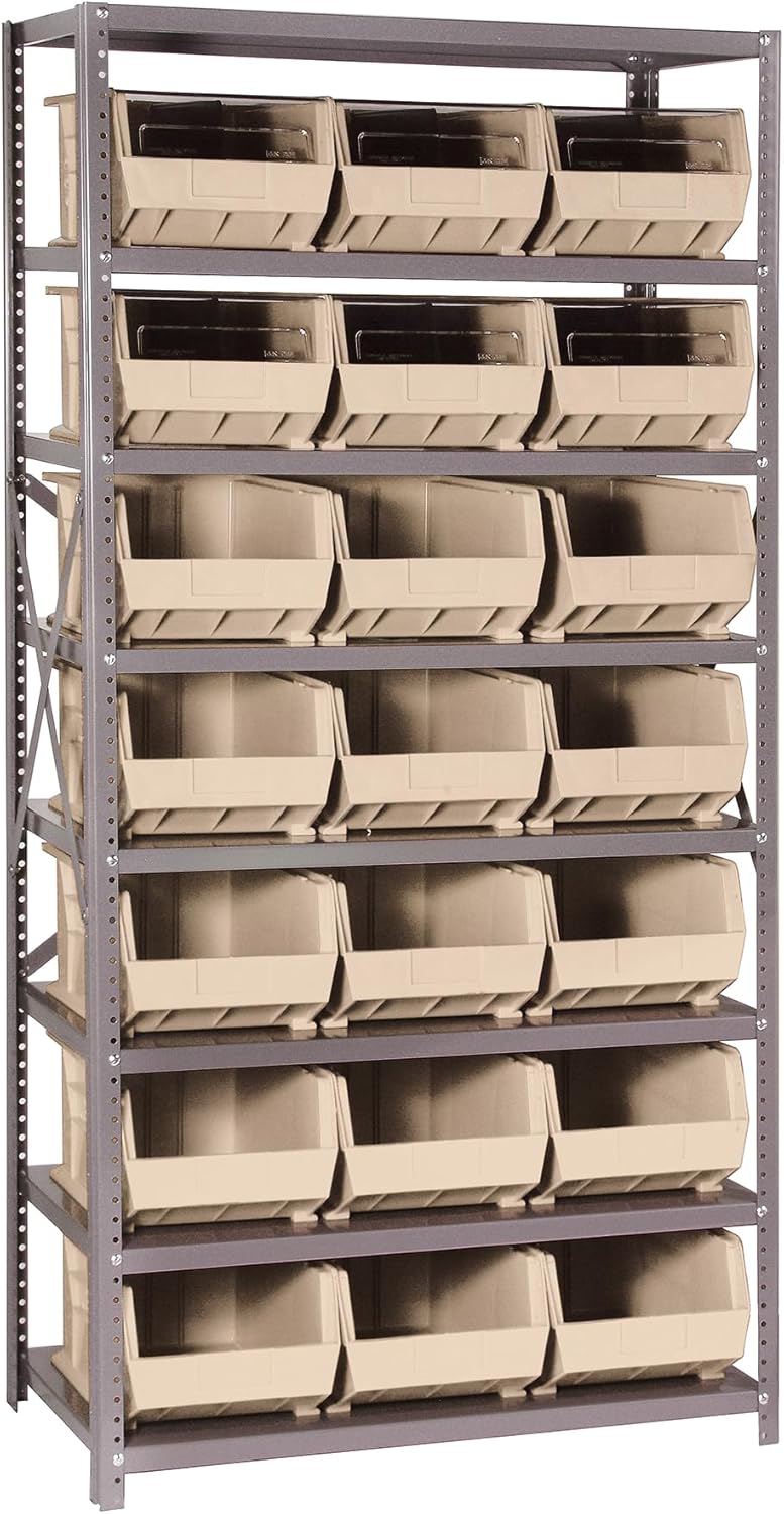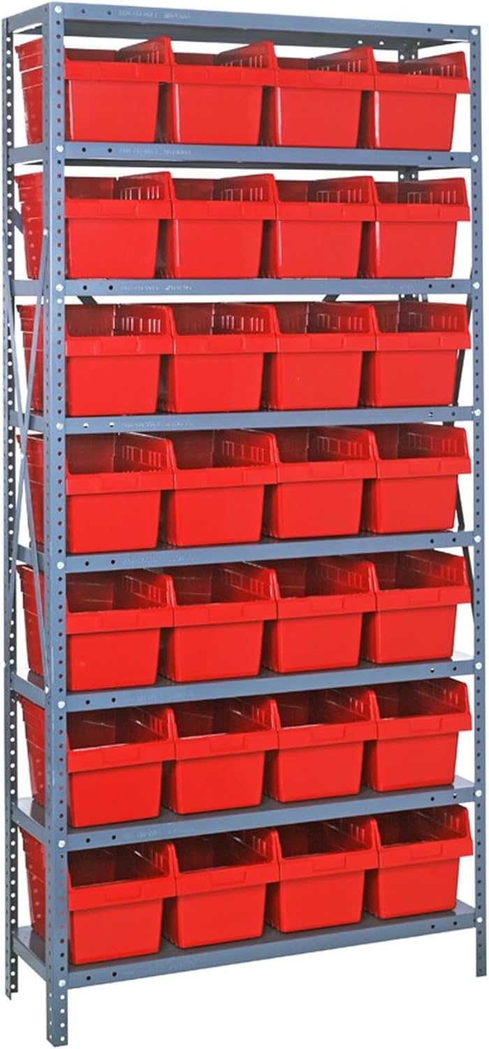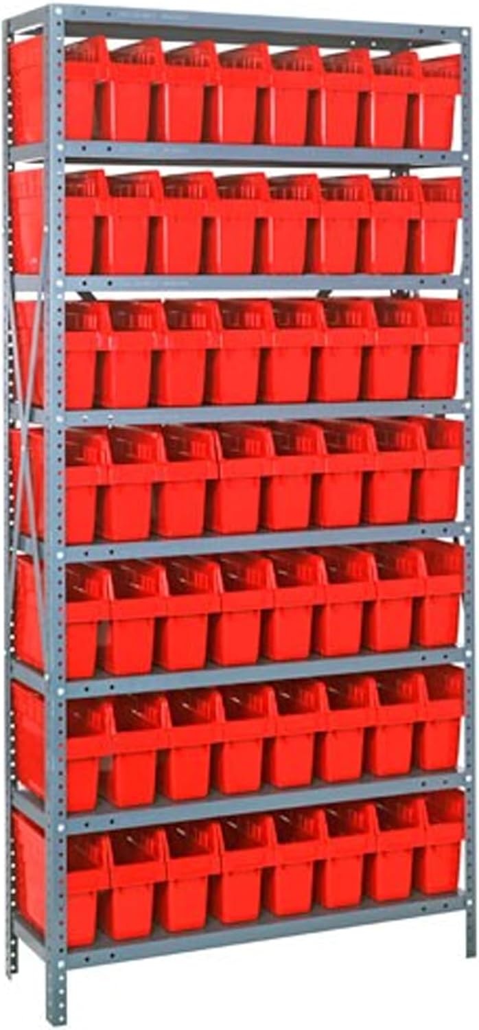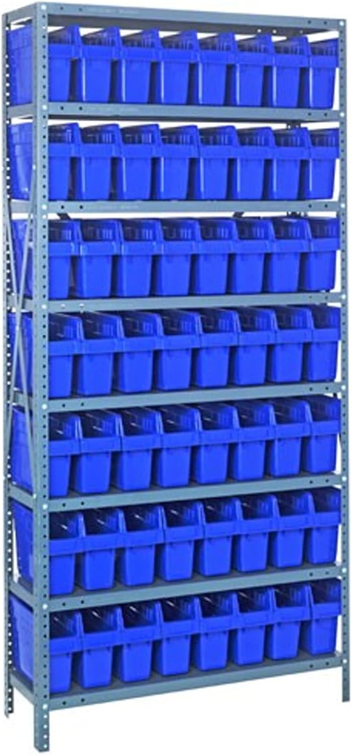 Shelving Unit, 24"D x 36"L x 75"H, heavy duty, 400 lb. load capacity per shelf, includes: (8) shelves, (12) 23-7/8"L x 8-1/4"W x 7"H (QUS950) and (12) 23-7/8"L x 11"W x 7"H (QUS952) bins available in multiple colors, uprights and cross bars, galvanized steel finish