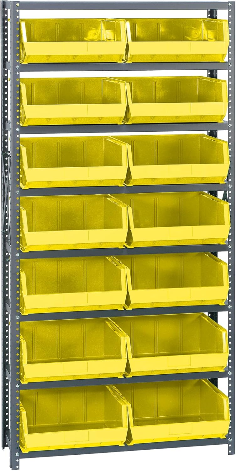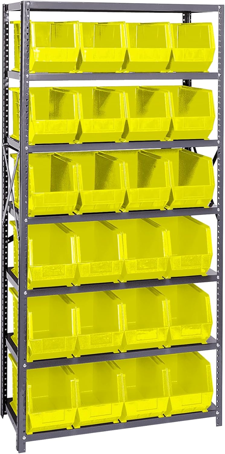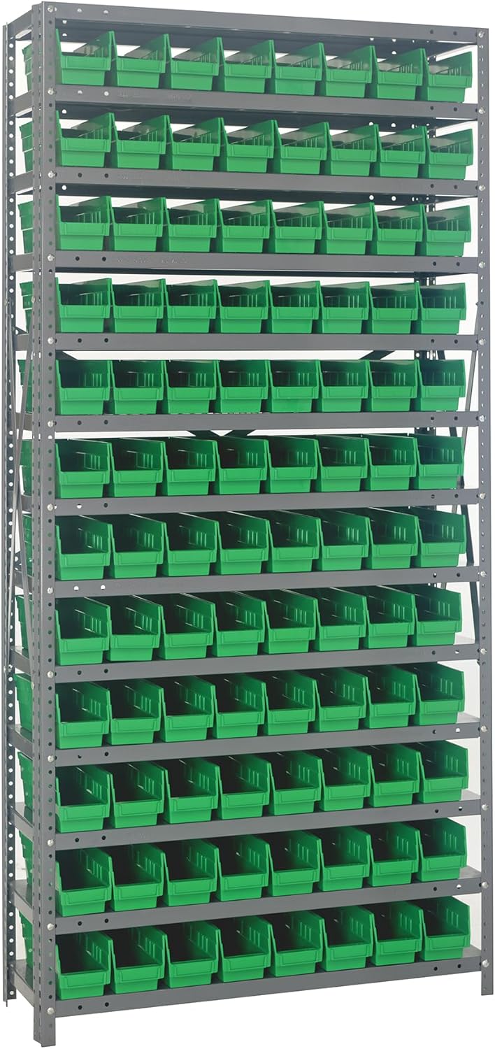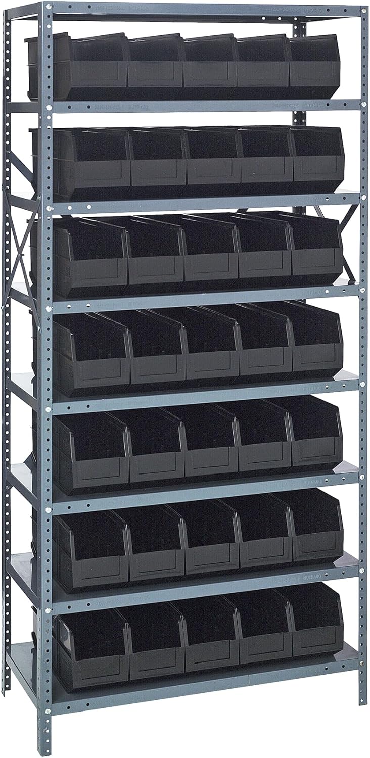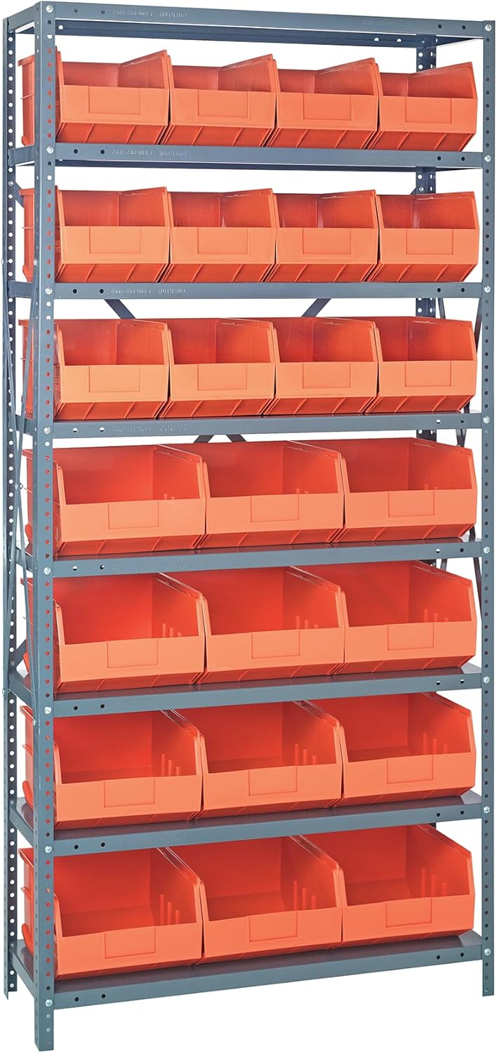 Shelving Unit, 24"D x 36"L x 75"H, heavy duty, 400 lb. load capacity per shelf, includes: (8) shelves, (12) 23-7/8"L x 8-1/4"W x 7"H (QUS950) and (12) 23-7/8"L x 11"W x 7"H (QUS952) bins available in multiple colors, uprights and cross bars, galvanized steel finish