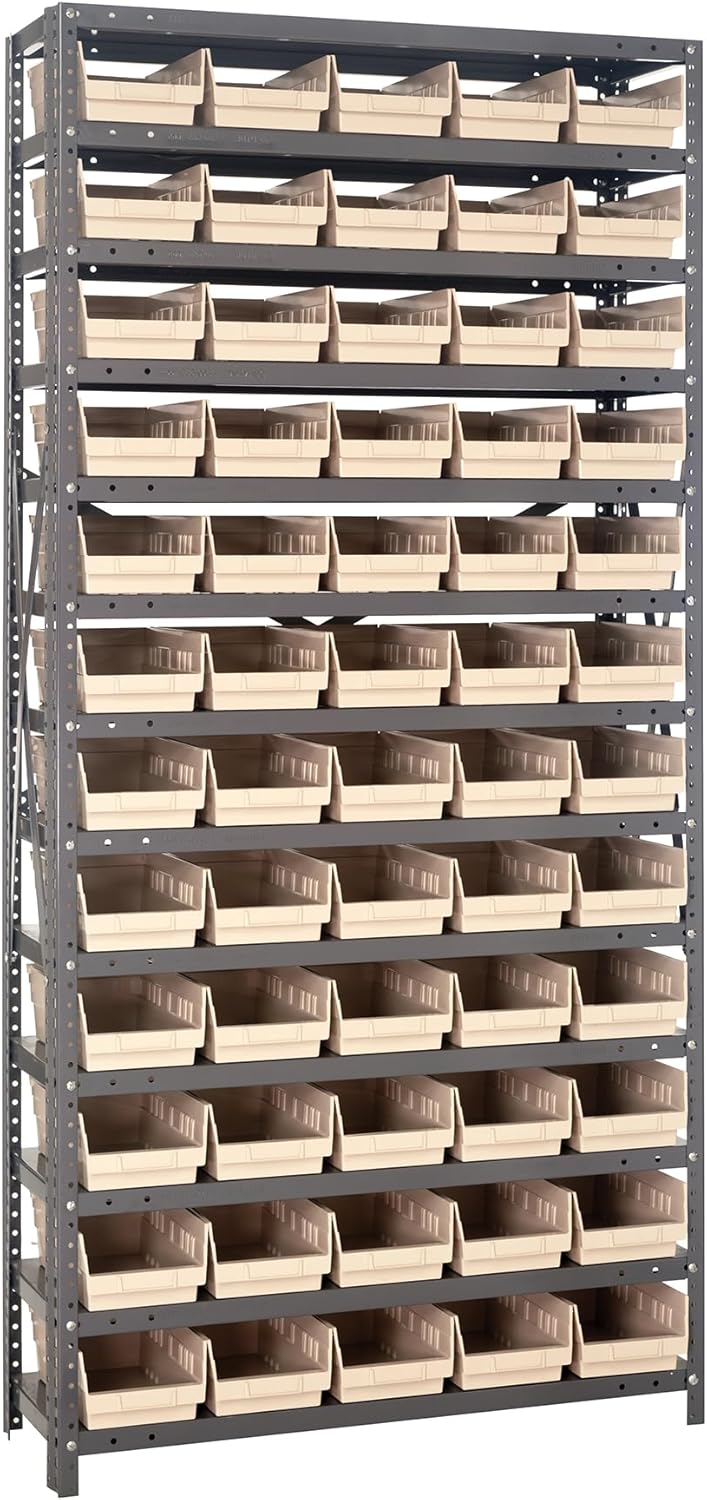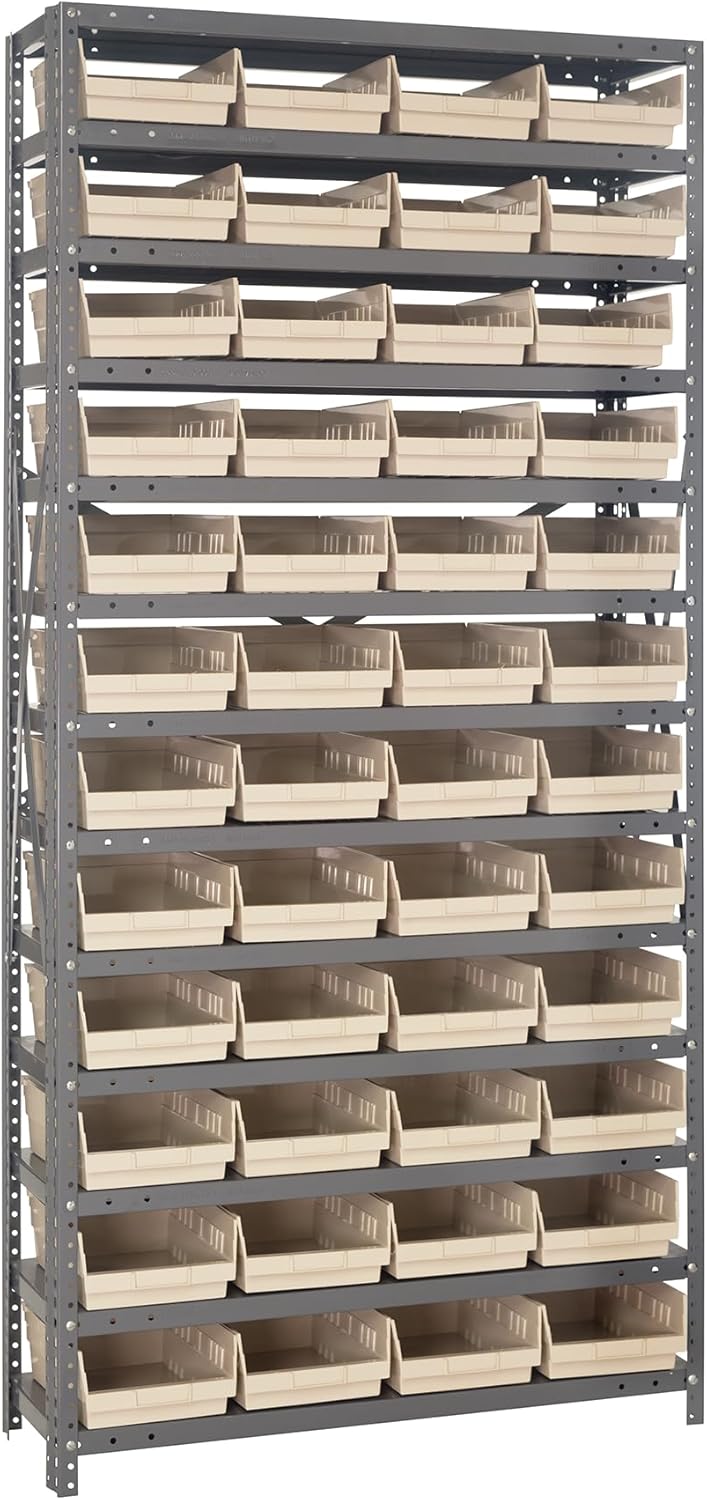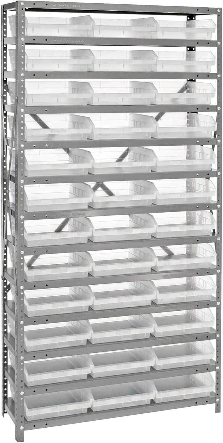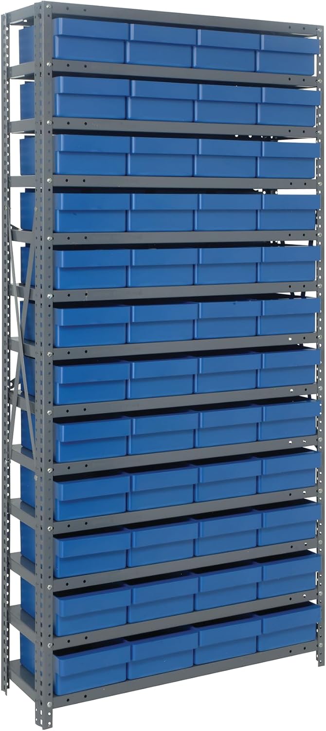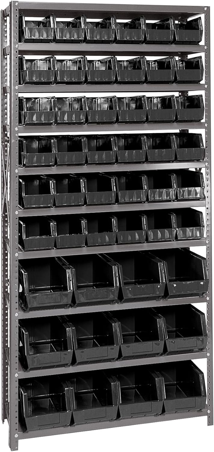 Shelving Unit, 24"D x 36"L x 75"H, heavy duty, 400 lb. load capacity per shelf, includes: (8) shelves, (12) 23-7/8"L x 8-1/4"W x 7"H (QUS950) and (12) 23-7/8"L x 11"W x 7"H (QUS952) bins available in multiple colors, uprights and cross bars, galvanized steel finish