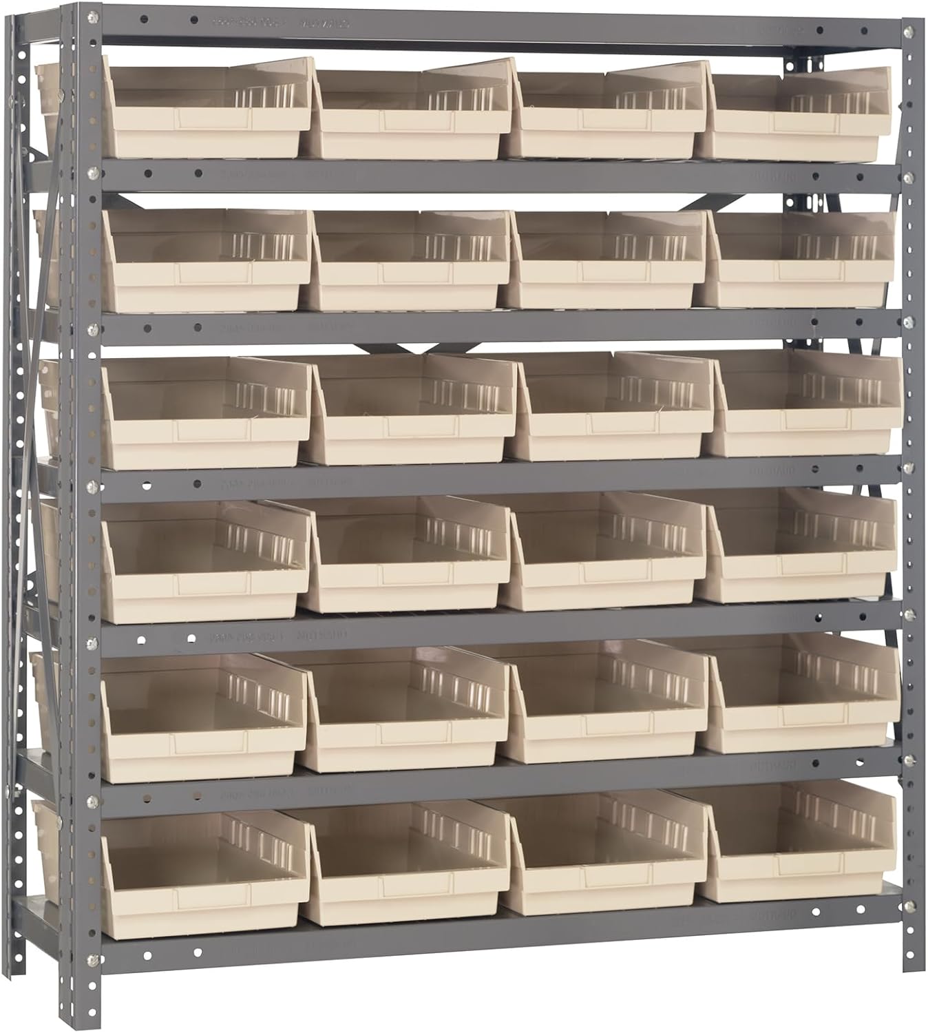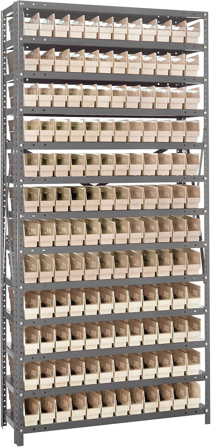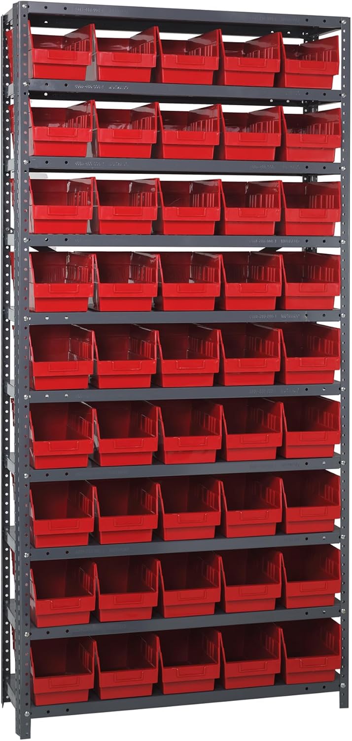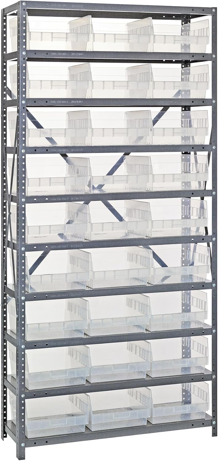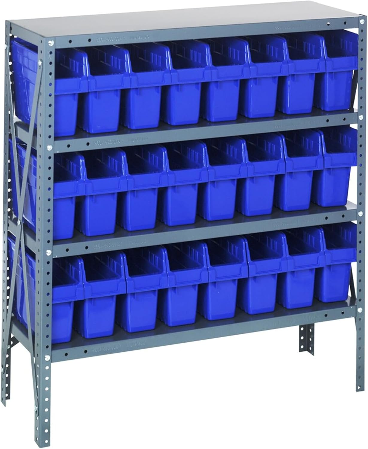 Shelving Unit, 24"D x 36"L x 75"H, heavy duty, 400 lb. load capacity per shelf, includes: (8) shelves, (12) 23-7/8"L x 8-1/4"W x 7"H (QUS950) and (12) 23-7/8"L x 11"W x 7"H (QUS952) bins available in multiple colors, uprights and cross bars, galvanized steel finish