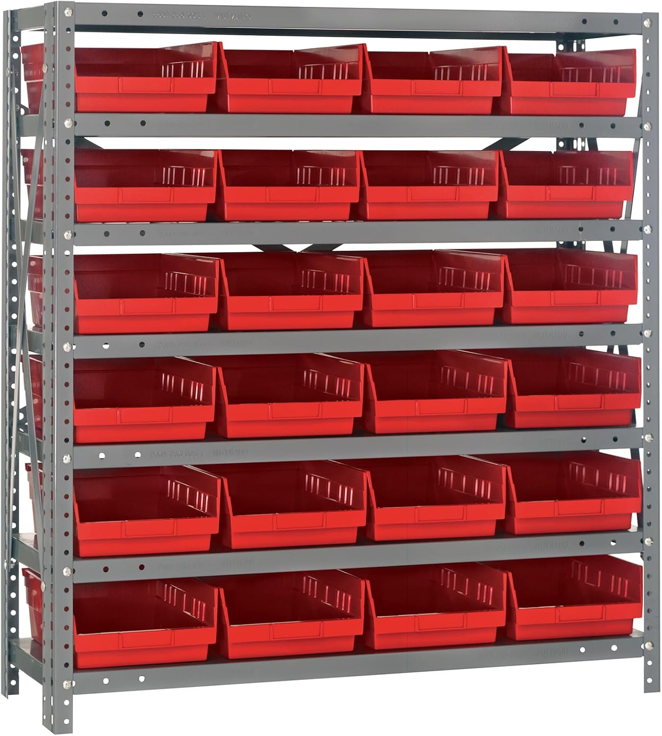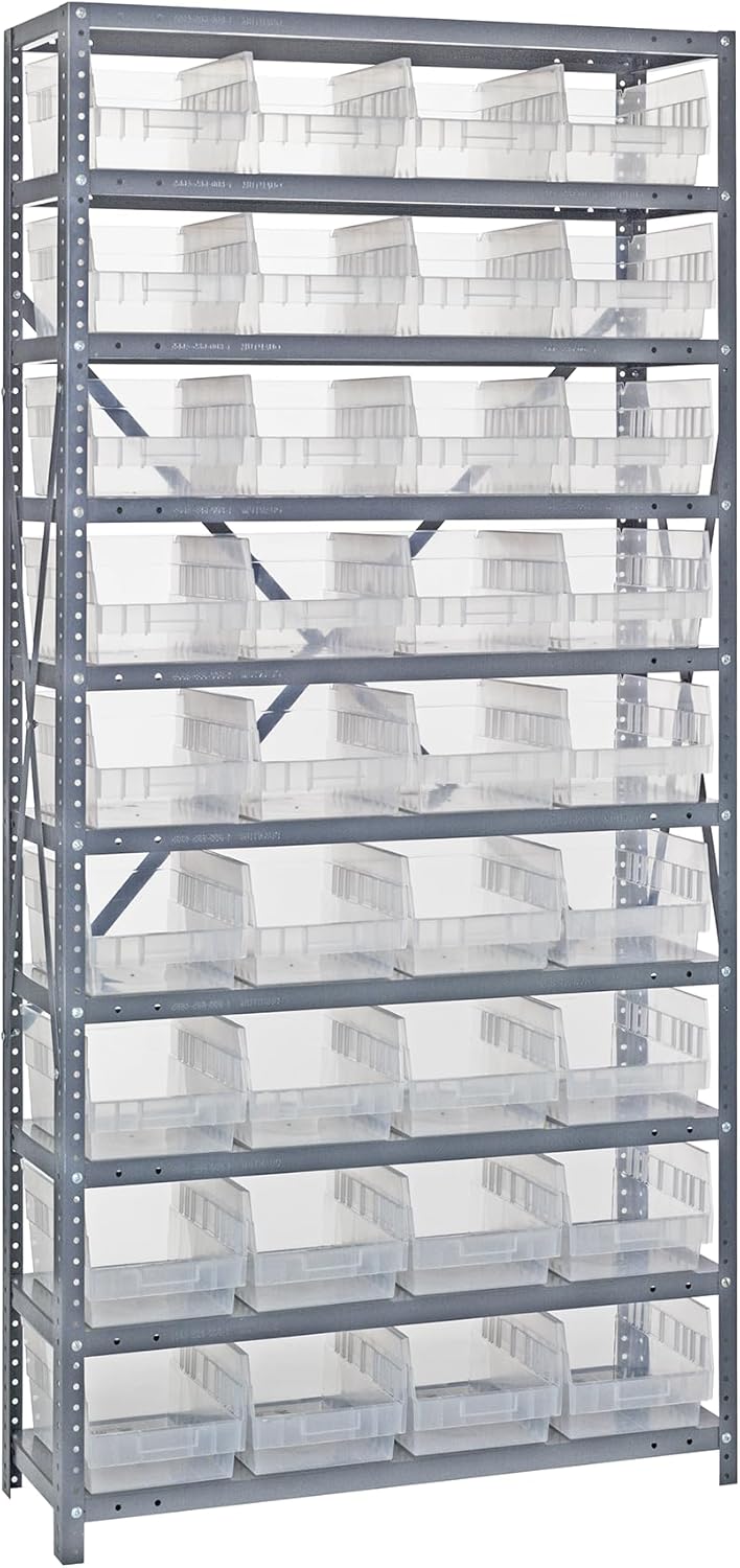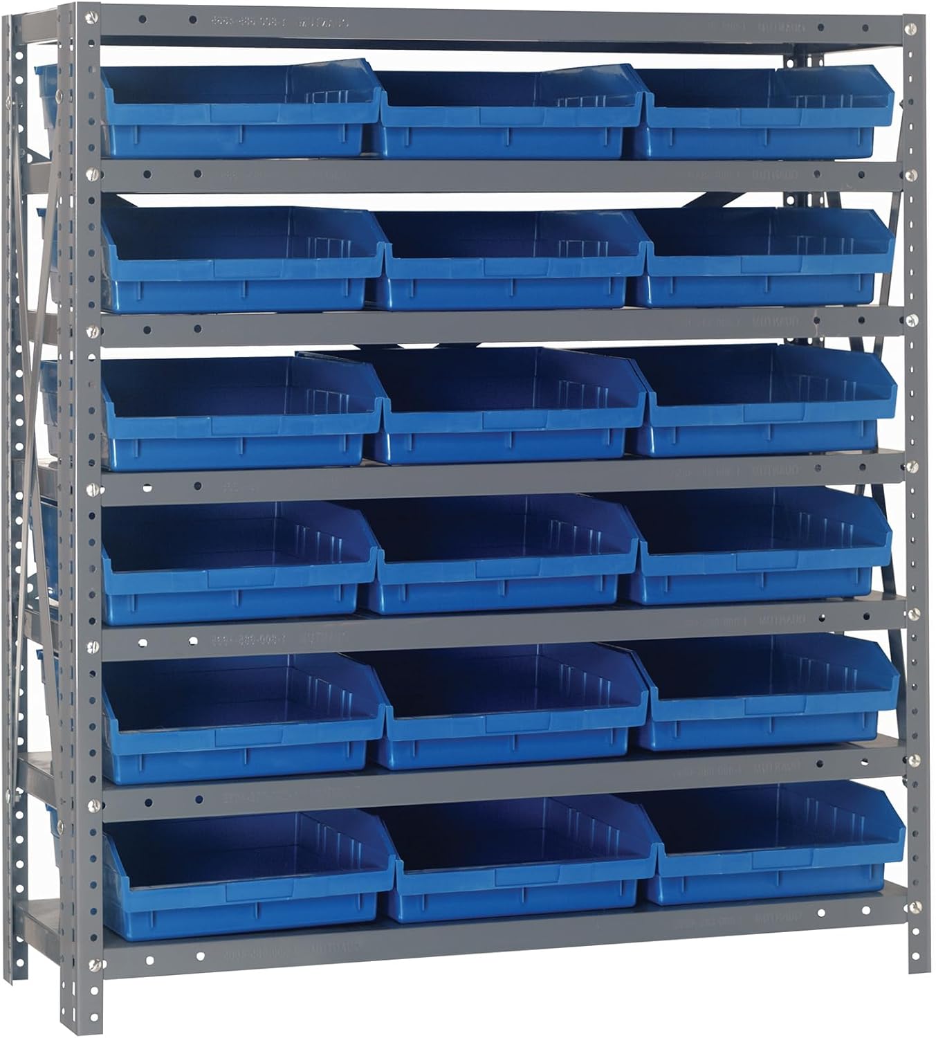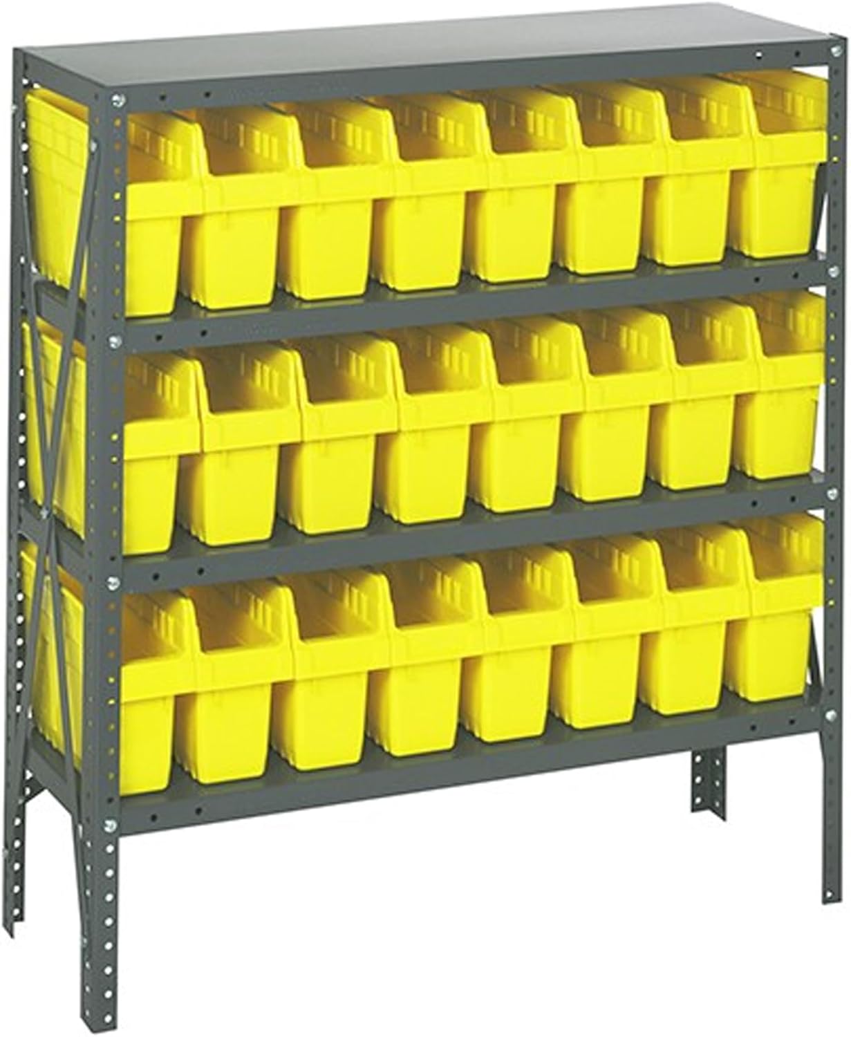 Shelving Unit, 24"D x 36"L x 75"H, heavy duty, 400 lb. load capacity per shelf, includes: (8) shelves, (12) 23-7/8"L x 8-1/4"W x 7"H (QUS950) and (12) 23-7/8"L x 11"W x 7"H (QUS952) bins available in multiple colors, uprights and cross bars, galvanized steel finish