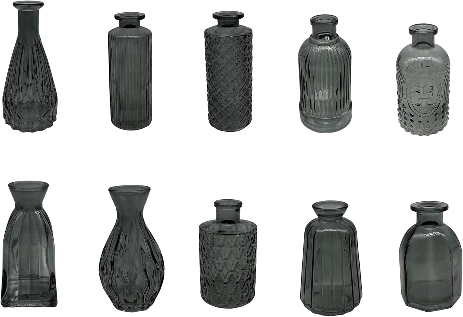 Whether for colourful dried flowers, delicate branches or small finds from a walk - this set of 10 mini vases offers many ways to decorate your home in style. The textured glass in a vintage look gives any table vase a special look and makes it a decorative eye-catcher. The flower vases are ideal as a table decoration or small highlight on the shelf – even a single flower is enough to add a beautiful accent. Vases set of 10 in detail: height: approx. 10-14.7 cm. Diameter: approx. 5-8 cm. Weight: each approx. 170 g. Material: glass. In various colours. Small glass vases for table decoration. Ideal for table decoration at weddings, celebrations or everyday life. Suitable for dried flowers, individual branches or grasses. Textured surface in vintage look for charming accents. Made of high-quality glass with thick base. Place vase set in the ensemble or place them individually. Box contents: 10 x decorative glasses in selected colour. Decorative items not included. included