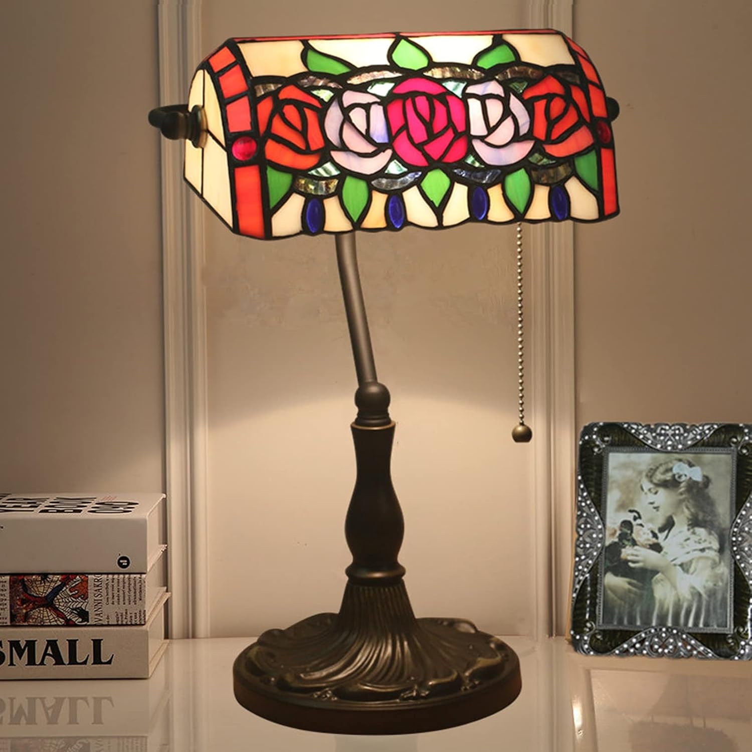●Tiffany Style Bankers Table Lamp Stained Glass Piano Desk Lamp Vintage bedroom Bedside lamp For Study,Antique Alloy base,Zipper switch,E27,110V-240V●Shade material:Tiffany style stained glass.Lamp holder material: alloy. Craft: handmade●Product size: 10.62" * 6.69" * 15.35" / 27 CM * 17CM * 39CM●Voltage: 110~240V. Lamp specifications: E27/E26.●Suitable for:office, study, library, bedroom, living room, bank, museum, school,study rooms, nursery, kindergarten, Bedside table,Bedside,Desk side,desk etc.Product packaging: 1 tiffany bankers lamp (without light source)Packing volume:49 cm * 39 cm * 27 cm.Weight: 2.5 KG.●AMAZING ARTISTIC WORK: The beautiful glass-work on this Tiffany bedside lamp is simply unrivaled. Wherever it is used, it is simply amazing. This tiffany light lamp is great artistic piece that speak to the soul.●MAGICAL HOME DECOR: If you have an aesthetic appreciation and likes to add something beautiful in your home, then you will always find a place in your home where you can incorporate this Tiffany lamp.● If your lamp has any defect or stops working, we help you troubles hoot and/or send replacement parts or a whole new product. If any problems arise, please contact us, our number one goal is customer satisfaction.