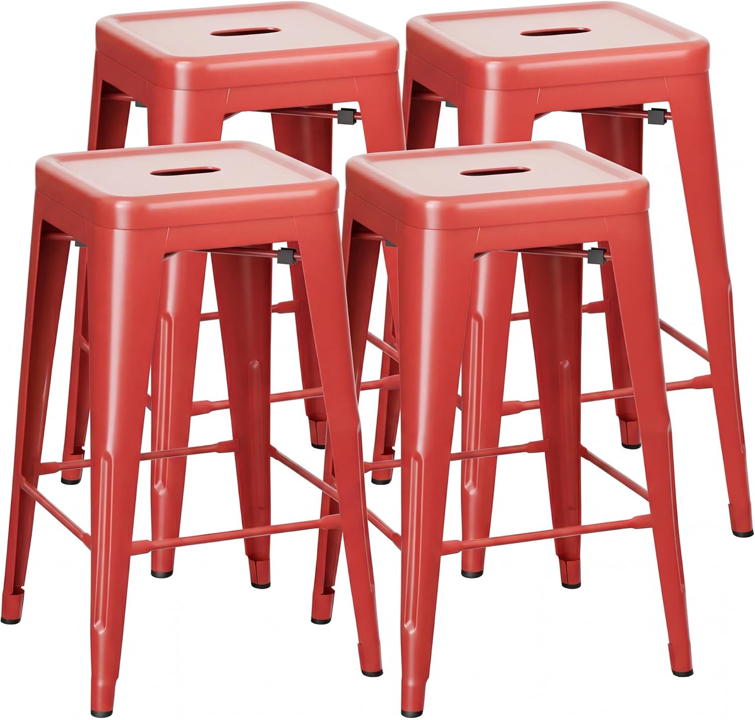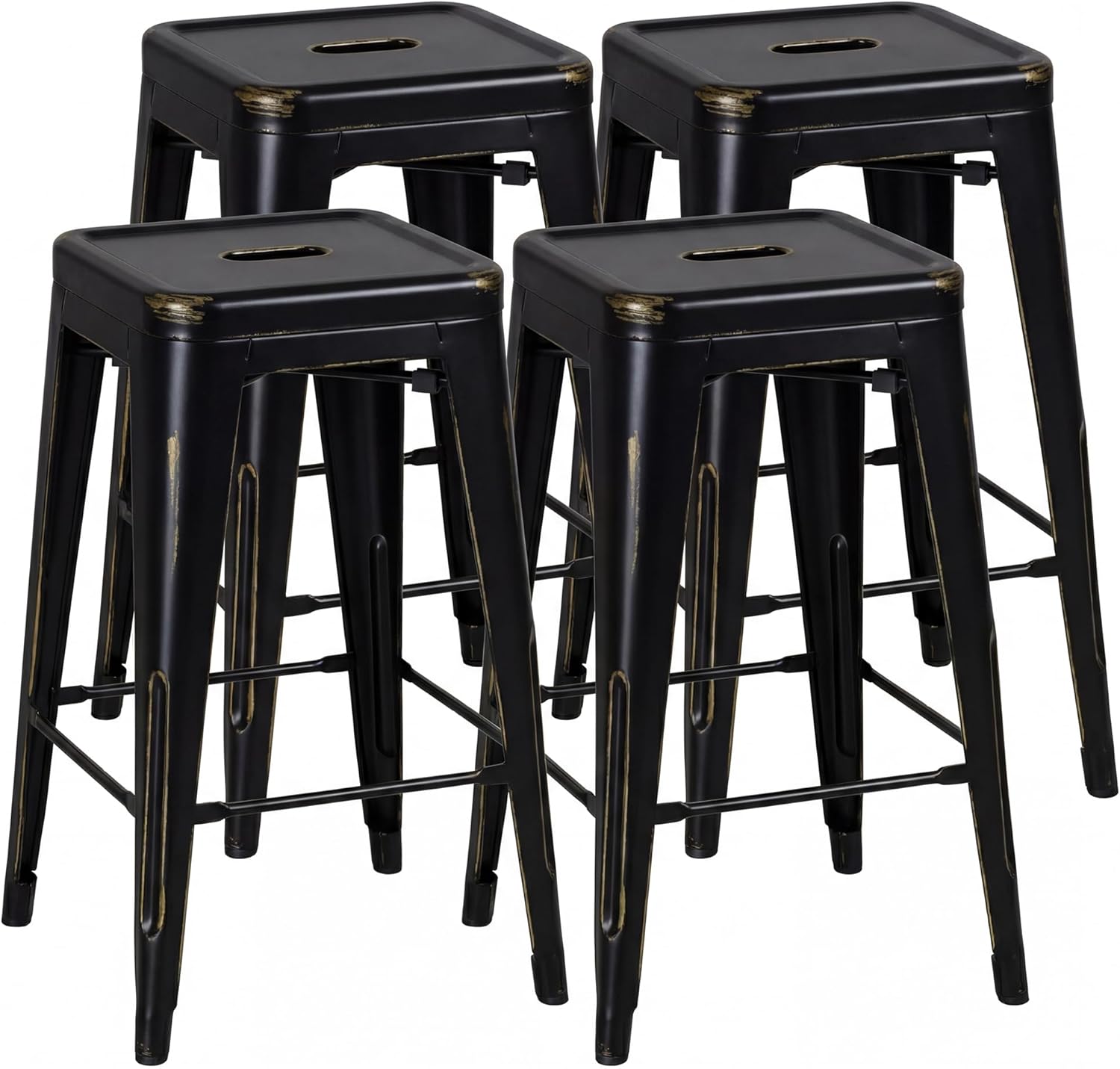 Shahoo Metal Bar StoolsFeature: Made of metal, capable of supporting 300 pounds. X-shaped frame provides stability and durability. Adapts to outdoor rain and moisture, with a surface that is resistant to stains and easy to clean. Double-layer varnish forms a protective film, providing long-lasting rust prevention and maintaining a good appearance. Stably stacked vertically, saving space and allowing for smooth access.Specification: Color: Black Material: Metal Package Dimensions: 37.01"(L) x 16.93"(W) x 16.93"(H) Package Weight: 41.34lbs Package includes: Four Metal Bar Stools A manual of installation and usage Notice: There may be some differences between photos and items in term of color because the influence of lighting during the shooting or the settings of the computers’ display screen.