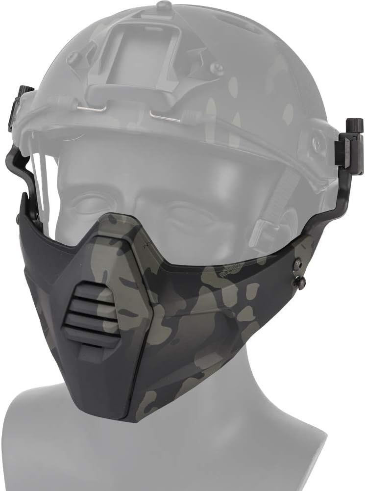 Product Information: Product Name:Tactical Multidimentional Split Type Mask Product Size:20*12cm Product Net Weight:0.265kg Product Colour:BCP, CP, Black, Tan, OD, Grey Main Material:TPE Product Feature: 1.TPE wear-resistant material 2.3D head circumference system design 3.Durable hook and loop,Ergonomic fitting design 4.Adapt to different guide rails,Free collocation shows personality 5.Applicable scene:Tactical equipments, movie props, outdoor leisure, daily leisure, family entertainment