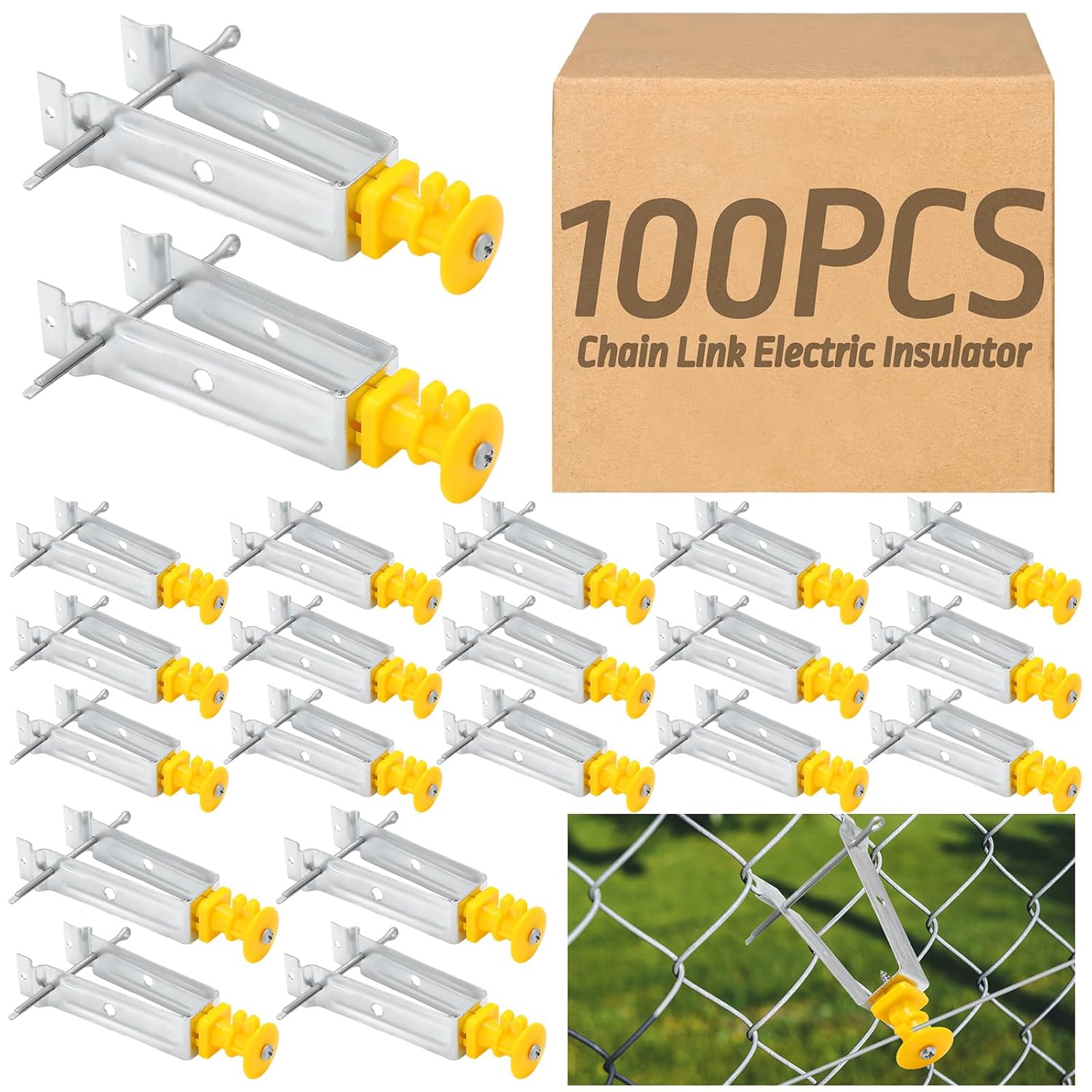Features: Packaged for convenience Each package includes 50 chain link insulator extenders, ensuring you have an ample supply on hand for your fencing needs. Whether you are working on a small section of fencing or have a large area to cover, we've got your needs covered. Security and fence maintenance: The chain link insulator plays a pivotal role in keeping animals far from the fence. It can hold one wire up to 3/8 inches which creates an effective fence and provides safety. Specifications: Material: heavy steel, plastic Color: yellow, silver Size: approx. 5.7 x 1.97 x 0.98/ inch/ 14.5 x 5 x 2.5 cm Package includes: 50 x Chain link insulator Notes: Manual measurement, please allow slight errors on size. The color may exist a slight difference due to different screen displays.